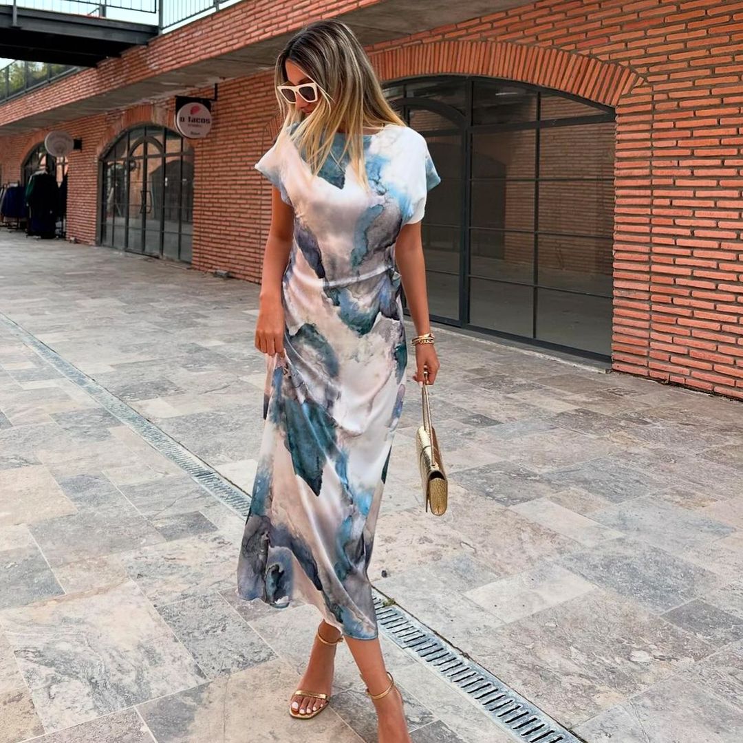 Uwolnij w sobie duszę fashionistki dzięki naszej satynowej sukience midi z nadrukiem. Ta wszechstronna sukienka ma okrągły dekolt i krótkie rękawy, idealna na każdą okazję. Luksusowa satynowa tkanina dodaje elegancji, a długość midi i kopertowy wygląd dodają jej uroku sylwetka. Wyraź siebie dzięki przyciągającemu wzrok nadrukowi. Podnieś swój styl już dziś!😍